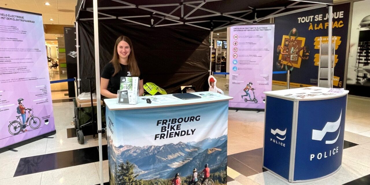 Diese Woche ist die Association Fribourg Bike Friendly in Zusammenarbeit mit der Kantonspolizei Freiburg im Einkaufszentrum Fribourg Centre auf das Publikum zugegangen. Anlass war die Sensibilisierungskampagne „Trails für alle, sicher und fair“, die sich dem Velo- und Mountainbikefahren widmet.