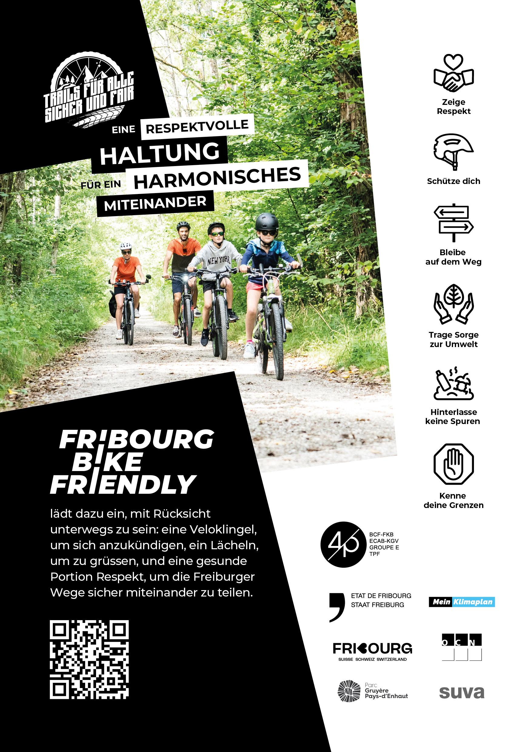 Das Nutzen der Wege ist ein Privileg, das Verantwortung mit sich bringt. Der Slogan „TRAILS FÜR ALLE, SICHER UND FAIR “ erinnert daran, dass jeder Ausflug mit Rücksicht auf andere Verkehrsteilnehmende und die Umwelt unternommen werden muss. Eine respektvolle Fahrweise zu befolgen bedeutet, eine geschützte Natur und ein erfolgreiches Zusammenleben zu gewährleisten.